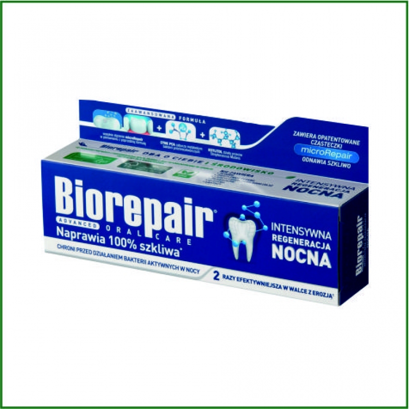 Pasta Biorepair® nocna regeneracja zawiera bioaktrywne mikrocząsteczki, które wnikając w miejsca uszkodzeń szkliwa i zębiny naprawiają je (remineralizują).W swoim składzie zawiera hydroksyapatyt- nieorganiczny minerał będący składnikiem kości i zębów (odpowiedzialny za ich mechaniczną wytrzymałość). Dla skuteczniejszego zapobiegania uszkodzeń szkliwa warto równiez korzystać z naszego topowego produktu Macerat 2 olej goździkowy PREMIUM. Za każdym razem nakropimy 1-2 krople bezpośrednio na szczoteczkę. Najskutecznejszy sposób na nieporządane bakterie, wirusy i grzyby. Należy pamiętać, że w szkliwie zębów nie ma żywych komórek i przez to nie ma naturalnbej regeneracji. Zniszczone szkliwo można regenerować stosując pastę Biorepair®. Im dłuższe działanie pasty, tym skuteczniejsza jest naprawa. Podczas snu nie ma zakłóceń w regeneracji poprzez picie (głównie słodkich napojów), spożywanie posiłków. Dbaj o zęby z pastą Biorepair® nocna regeneracja i dodatkowo z Macerat 2 olej goździkowy PREMIUM.