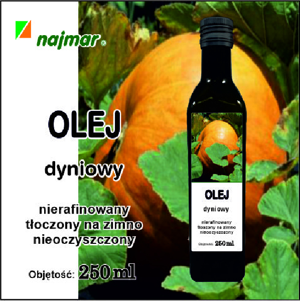 NASZ OLEJ DYNIOWY = ZDROWIENasz surowy olej dyniowy ma wszelkie cechy oleju dziewiczego. Wytłaczany jest z polskich nieprażonych pestek dyni. Cechuje go typowy dla pestek dyni zapach i smak. Kolor jest ciemnorubinowy. Najczęściej spotykany w handlu olej dyniowy jest koloru zielonego. Wg posiadanej wiedzy prawidłowy kolor jest ciemnorubinowy. Podobno wytłoczony z pestek prażonych jest zielony. Ja z prażonych nigdy nie tłoczyłem. Nasz olej posiada wszelkie cechy oleju dziewiczego.Jego smak jest na prawdę wyjątkowy. O tym przekanały się wszystkie osoby pijące czy używające nasz olej. Ponieważ jest to produkt naturalny, więc kolejne partie produkcyjne mogą nieznacznie różnić się między sobą : kolorem (jaśniejszy-ciemniejszy), zapachem. smakiem i konsystencją. Są to cechy niemające wpływu na skład i jakość oleju. Pod wpływem niskiej temperatury (przechowywanie w lodówce) olej może tężeć. Jest to zjawisko naturalne, zależne od temperatury, w pełni odwracalne. Zalecamy: do bezpośredniego spożycia, do surówek, z chlebem, polewa na lody, naleśniki, ciastka, do soków owocowo warzywnych itp.Bardzo smaczne smarowidło w połączeniu z olejem kokosowym (70% oleju kokosowego i 30% oleju dyniowego). Olej zawiera naturalny osad.Po otwarciu zalecamy przechowywać w lodówce.Kraj pochodzenia surowca: Polska Wartość odżywcza w 100g produktuWartość energetyczna 3700 kj/900 kcal